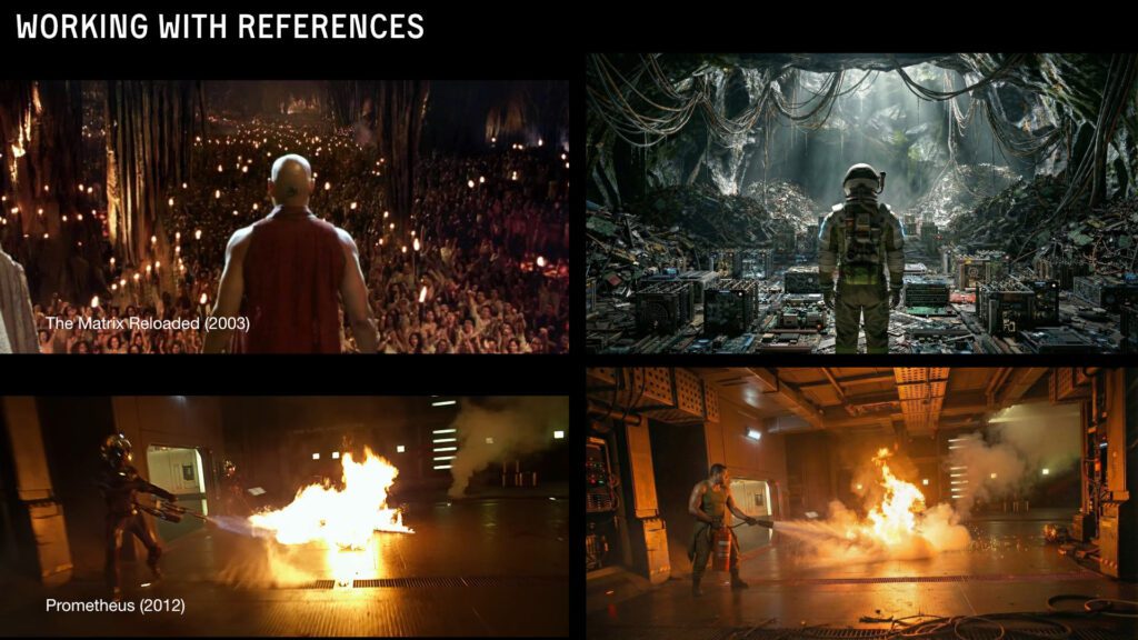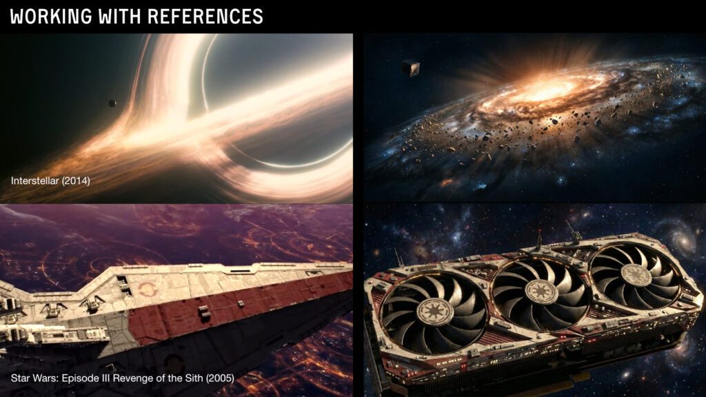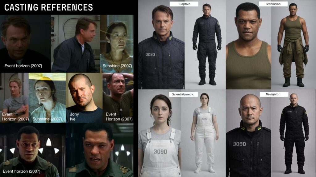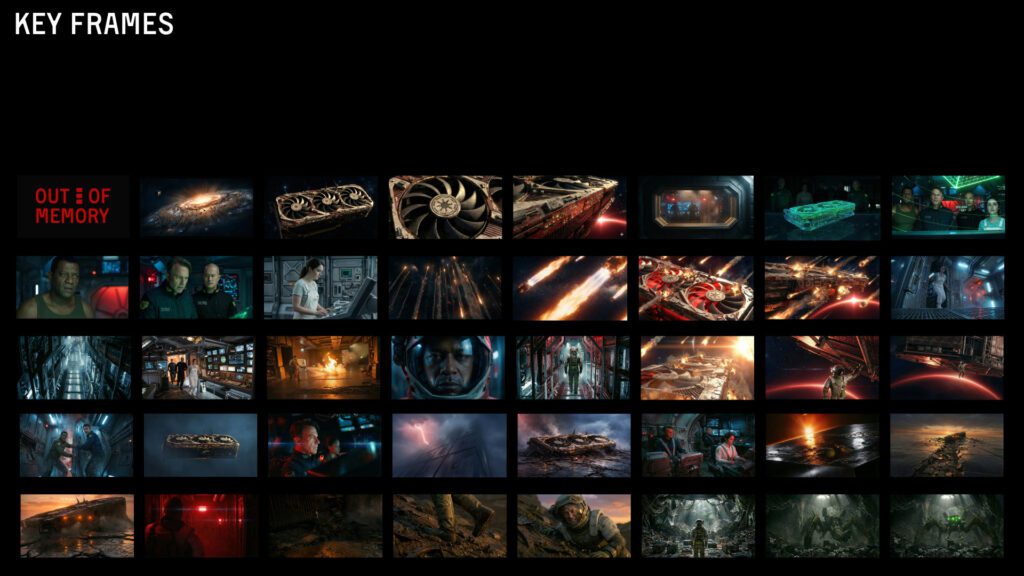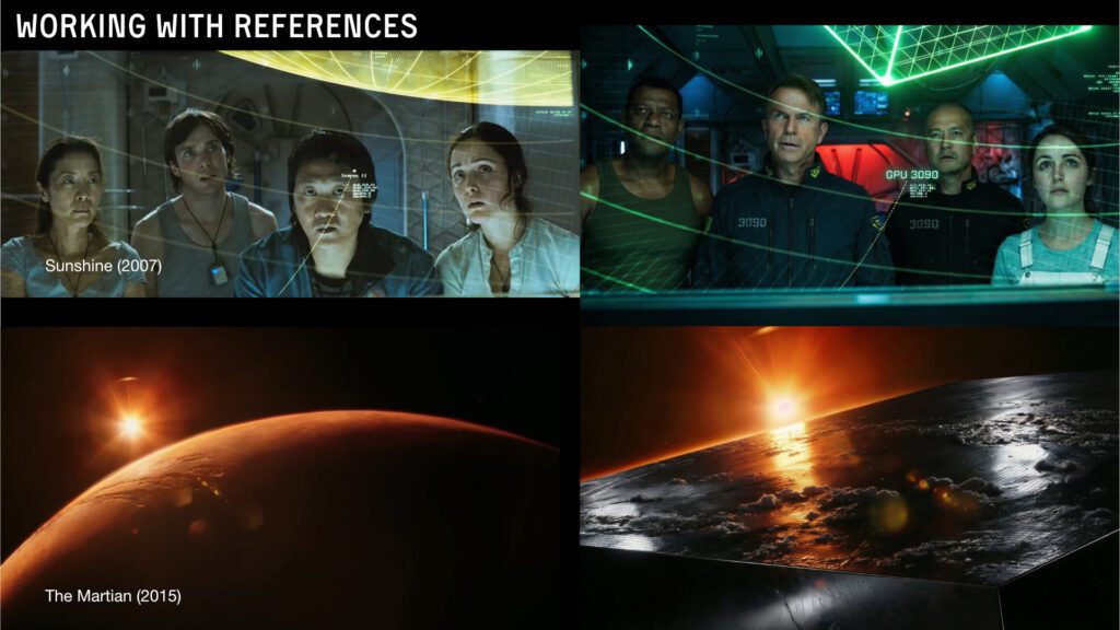 The story started with a simple idea. A giant RTX 3090 spaceship slowly going down because the AI models got too damn big and there just isn’t enough memory to hold it together. I mixed my favorite directors into one thing, Nolan, Scott, Danny Boyle and a few others. The references were Event Horizon, Sunshine, Interstellar, Gravity, Prometheus, Ad Astra, The Martian, Star Wars.